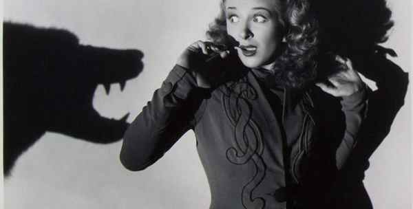 Shopkeeper’s daughter and the object of Lawrence Talbot’s affection, Gwen Conliffe (Evelyn Ankers), threatened by a looming lupine apparition.